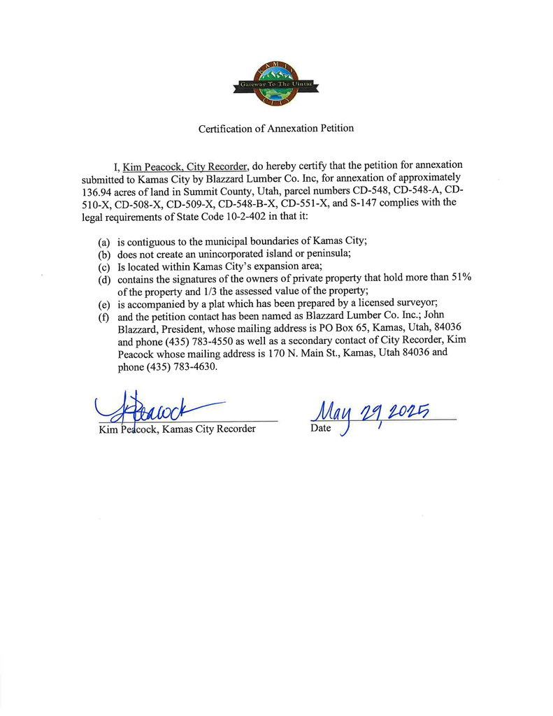 The Kamas City Council will hold a public hearing on Tuesday, July 8, 2025. The meeting will begin at 6:00 p.m. in the Kamas City Hall, 170 N. Main, Kamas. The purpose of the hearing is to receive public comments on the proposed Blazzard Annexation for Parcels CD-548, CD-548-A, CD-510-X, CD-508-X, CD-509-X, CD-548-B-X, CD-551-X, and S-147 located in Summit County, Utah, which parcels borders Kamas City to the northwest. Information regarding the request is available at the Kamas City Hall. In compliance with the Americans Disabilities Act, individuals needing special accommodations during this hearing should notify the City Clerk (783-4630) at least 3 days prior to the hearing.
